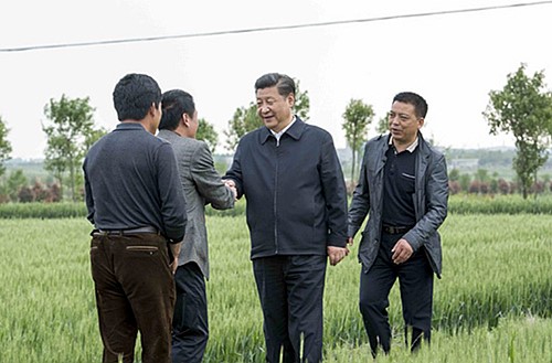 總書記來到小崗村4300畝高標(biāo)準農(nóng)田示范點,沿著田埂走進麥田,察看小麥長勢,向村干部、種糧大戶和農(nóng)技人員了解土地流轉(zhuǎn)、農(nóng)田整理、種植品種、畝產(chǎn)量、病蟲害防治、糧食收購等情況。