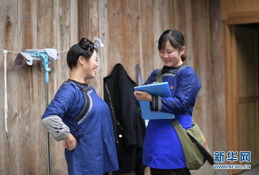 貴州省黔東南苗族侗族自治州榕江縣平江鎮(zhèn)巴魯村網(wǎng)格員劉園(右)走訪結(jié)對幫扶戶時,與村民韋福琴核對生產(chǎn)生活情況(2020年11月16日攝)。新華社記者 楊楹 攝