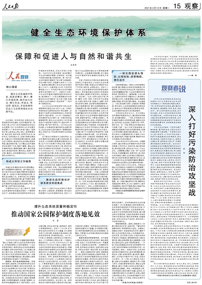 習(xí)近平總書記指出:“生態(tài)是統(tǒng)一的自然系統(tǒng),是相互依存、緊密聯(lián)系的有機(jī)鏈條?!薄吨腥A人民共和國國民經(jīng)濟(jì)和社會(huì)發(fā)展第十四個(gè)五年規(guī)劃和2035年遠(yuǎn)景目標(biāo)綱要》堅(jiān)持系統(tǒng)觀念,堅(jiān)持綠水青山就是金山銀山理念,對推動(dòng)綠色發(fā)展、促進(jìn)人與自然和諧共生作出了全面部署。本期觀察版圍繞健全生態(tài)環(huán)境保護(hù)體系這一主題,從推動(dòng)生態(tài)環(huán)境保護(hù)體系建設(shè)系統(tǒng)集成、形成大環(huán)保工作格局、深入打好污染防治攻堅(jiān)戰(zhàn)、推動(dòng)國家公園保護(hù)制度落地見效等方面進(jìn)行探討。