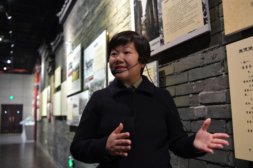 在中央紅軍長(zhǎng)征出發(fā)紀(jì)念館,副館長(zhǎng)鐘敏正在給參觀的游客介紹長(zhǎng)征的歷史(4月6日攝)。新華社記者 彭昭之 攝