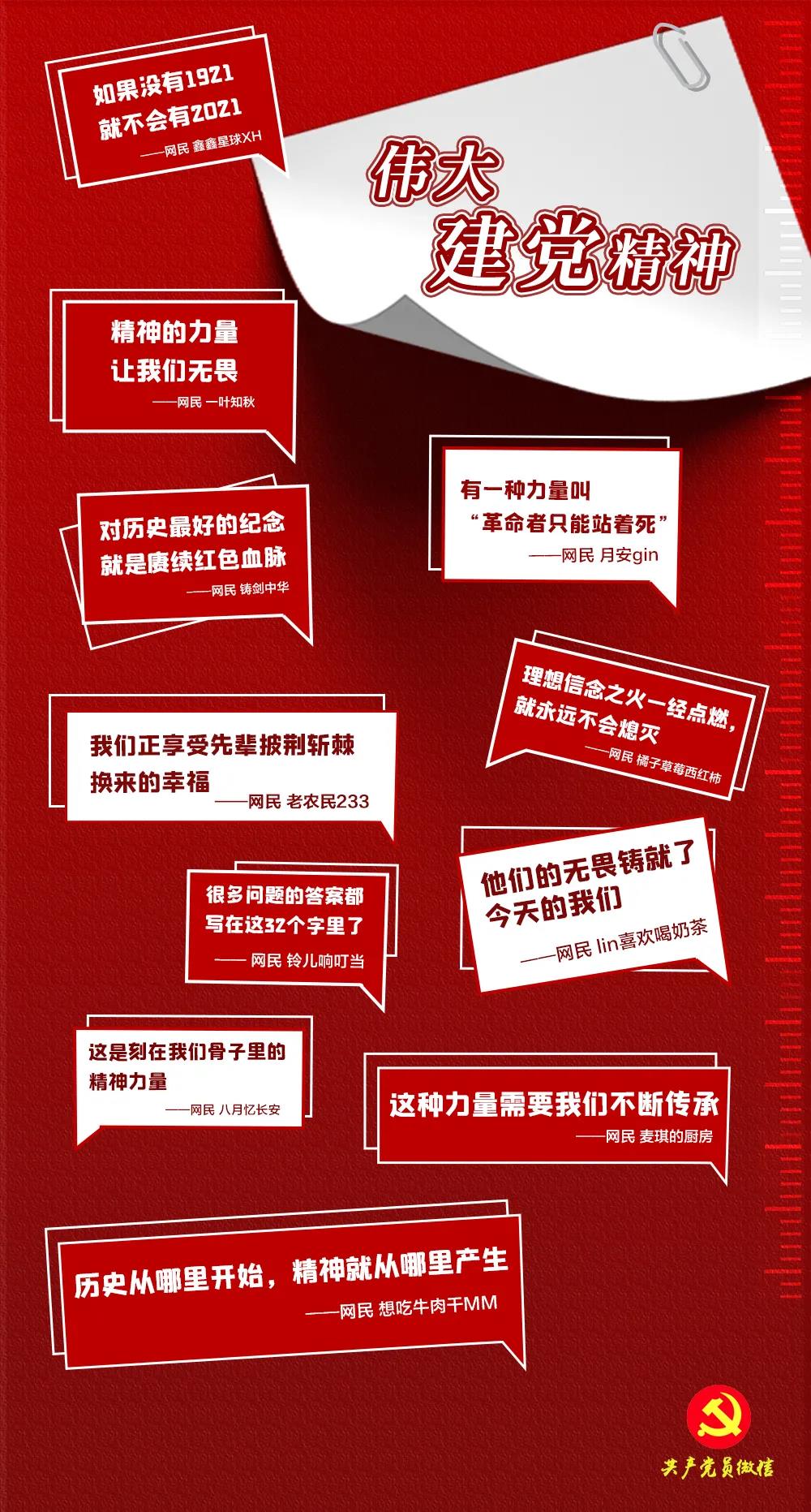 人無精神不立,國(guó)無精神不強(qiáng)。一百年來,一代代中國(guó)共產(chǎn)黨人,頑強(qiáng)拼搏、不懈奮斗,形成了一系列偉大精神,構(gòu)筑起了中國(guó)共產(chǎn)黨人的精神譜系。這些偉大精神猶如熠熠火焰,照亮了跋山涉水的征程。在抗擊疫魔的戰(zhàn)場(chǎng),在星辰大海的征途,在高原邊關(guān)的戰(zhàn)位,在鄉(xiāng)村振興的一線……精神的火焰永遠(yuǎn)向上,精神的火炬代代相傳。這些偉大精神,讓廣大網(wǎng)民們深受感染、深受感動(dòng)、深受鼓舞,紛紛寫下感想和思考。讓我們一起看看他們的精彩留言,近距離感受百年大黨風(fēng)華正茂的“精神密碼”。