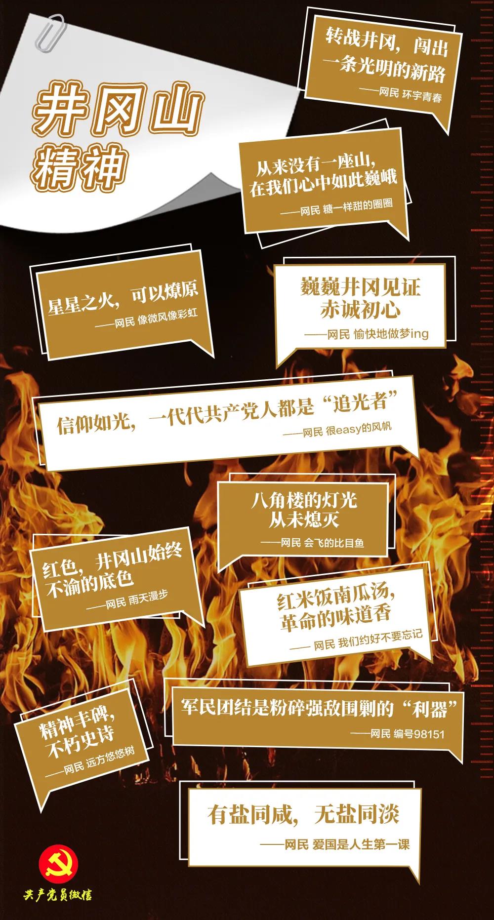 星星之火,終成燎原之勢(shì)。精神之光,燭照著中國(guó)革命一步步邁向成功,指引著中華民族偉大復(fù)興的新征程。挑糧的小道,八角樓的燈光,黃洋界的炮聲……撫今追昔,一個(gè)個(gè)銘刻在歷史上的印記,愈發(fā)熠熠生輝,震撼人心、砥礪前行。在社交平臺(tái)上,許多網(wǎng)民紀(jì)念那段崢嶸的井岡歲月,寫下對(duì)歷史的告白,堅(jiān)定對(duì)精神的傳承。