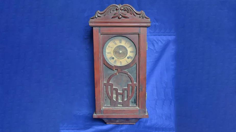 遵義會(huì)議的會(huì)議室東墻上有個(gè)掛鐘,長(zhǎng)50厘米、寬22厘米、厚11厘米,是一架自鳴木殼機(jī)械擺鐘,刻度為羅馬數(shù)字,鐘頂飾有變形植物圖案木雕,底部為倒梯形木座,鐘面有玻璃門(mén),門(mén)的四周有木質(zhì)雕花邊框。
