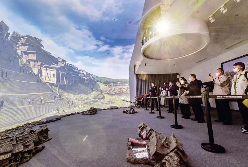 近年來(lái),重慶紅巖革命紀(jì)念館以新技術(shù)把革命文物搬上屏幕和舞臺(tái),創(chuàng)新革命文物展示,讓紅巖革命文物“活”起來(lái)。圖為在重慶紅巖革命紀(jì)念館“紅巖記憶”數(shù)字體驗(yàn)廳內(nèi),觀眾們觀看以雙曲三維穹幕技術(shù)展示的場(chǎng)景。 新華社記者 李賀/攝