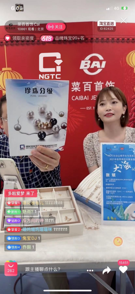 海洋日當(dāng)天珠寶國(guó)檢(NGTC)充分發(fā)揮自身科學(xué)檢測(cè)及教育培訓(xùn)的專業(yè)優(yōu)勢(shì),由珠寶國(guó)檢(NGTC)教育專家——NGTC國(guó)檢珠寶培訓(xùn)中心商學(xué)院副院長(zhǎng)、資深講師張斌與菜百首飾天貓旗艦店、淘寶店的專業(yè)主播一起,通過(guò)NGTC+直播間·一直播平臺(tái),菜百首飾天貓旗艦店、菜百首飾淘寶直播間,礦業(yè)界微信公眾號(hào)聯(lián)合直播,為線上觀眾在線介紹珍珠的品質(zhì)分級(jí)原理及方法,解讀珠寶首飾的質(zhì)量保證——珠寶國(guó)檢(NGTC)證書,分享選購(gòu)與保養(yǎng)等科學(xué)消費(fèi)知識(shí)。