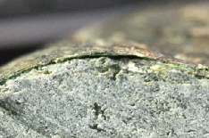 圖3 樣品縱截面圖,人造皮殼由一層蠟質(zhì)外觀和一層綠色粉末層組成(15╳)