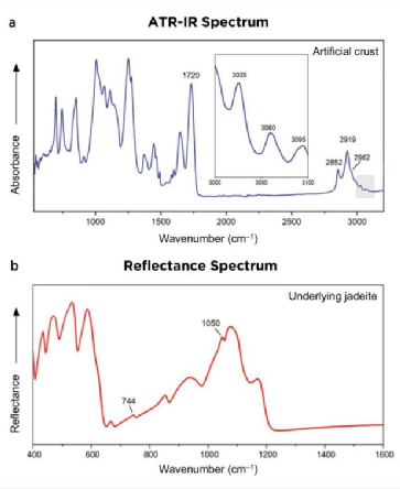 使用紅外光譜儀以衰減全反射率法(ATR)和漫反射法進行測試,測試譜圖如圖4所示。如圖4a可知外層蠟皮殼在1500-2000cm-1范圍內(nèi)具有吸收帶,與蠟的特征相收相似,同時在2852、2919、2962、3035cm-1處出現(xiàn)與環(huán)氧樹脂有關(guān)的特征吸收。在皮殼脫落部位進行漫反射測試,如圖4b所示在744和1050cm-1處有吸收峰,以及400-600 cm-1之間的四個譜帶,這與硬玉的特征吸收一致。這種人造皮殼可通過其低硬度,異常的紫外熒光和紅外光譜檢測等手段來進行檢測區(qū)分。