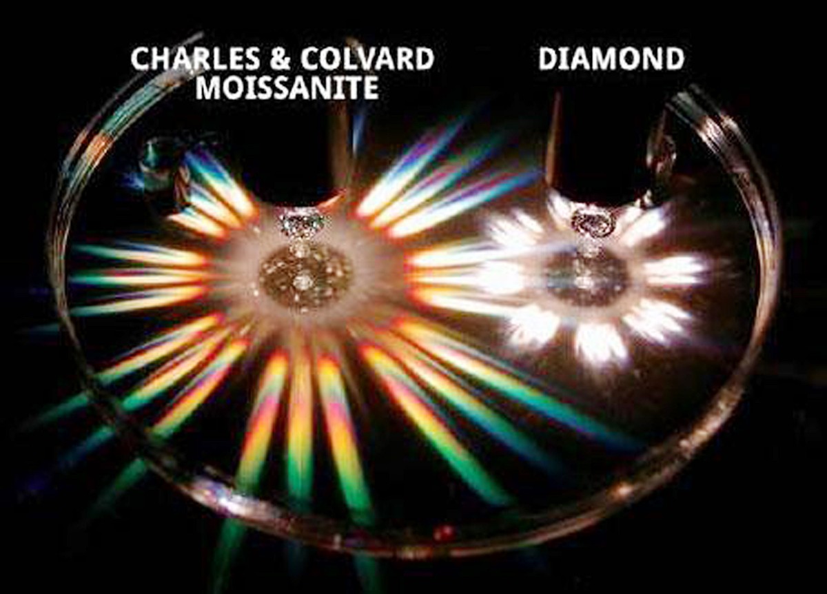 莫桑石(左)和鉆石(右)的火彩測試,很明顯莫桑石的火彩要優(yōu)于鉆石。