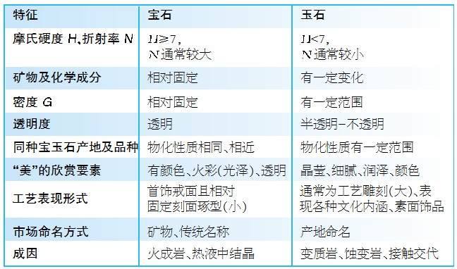 就珠寶的大類來說,可分為寶石與玉石兩大類。寶石是天然礦物單晶體,玉石則指天然礦物的集合體。在礦物成分構(gòu)成、物理化學(xué)性質(zhì)、接受的人群、飾品的表現(xiàn)形式上兩者盡管有相似之處,但更有差異。寶石與玉石的異同見下表。這里的玉石主要指接受面較廣、市場占有率較高的翡翠、和田玉,寶石指以鉆石、紅藍(lán)寶石、祖母綠、海藍(lán)寶石、碧璽、石榴石等為代表的常見寶石。