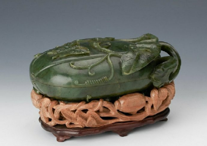 瓜蝶碧玉盒,清代。呈橢圓形。通體雕成一瓜蔓纏繞的香瓜狀。器蓋相連,子母口。蓋面雕飾一展翅的蝴蝶。配鏤雕纏枝瓜藤形黃楊木座。瓜蝶,寓意瓜瓞綿綿,子孫興旺,世代相傳。此盒構(gòu)思巧妙,造型別致,盤(pán)曲的藤蔓、枝葉處理恰到好處,靜中寓動(dòng),自然和諧,既是首飾盒,又是精美的工藝品。
