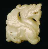 麒麟呈匍形姿,挺胸昂首,口微張露出利齒,下頜垂須貼胸,突自大鼻,耳后抿,雙角端部上卷,肩生雙翼舒展,大尾下垂。麒麟形體壯碩穩(wěn)健,神態(tài)威武兇悍,飄動的卷須和張開的雙翼更顯得氣勢不凡。這件玉麒麟在雕工上運用了透雕、凸雕、陰刻和偏斜刀等多種技法,其口以桯鉆法鏤空,眼、耳、角壓地陰起,角、翼、四肢和尾凸雕而成,兩翼中間一道凹槽將其一分為二,胸前的橫向平行弧線、腮和翼端的卷云紋以偏斜刀法琢刻,胡須、兩翅和腿、爪刻細陰線。雕工十分精細,碾磨技藝高超,晶瑩潤澤。這件麒麟上窄下寬,重心較低,且沒有穿孔可供穿系佩帶,屬陳設擺件。