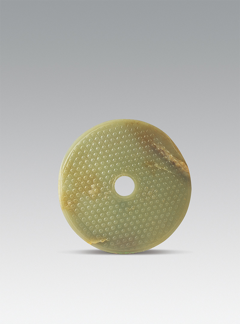 這件玉璧碧色青白,正反兩面紋飾相同,璧身內(nèi)外緣各有一圈弦紋,其間滿飾凸起的谷紋,排列有序,大小均勻,屬典型的漢代玉璧。