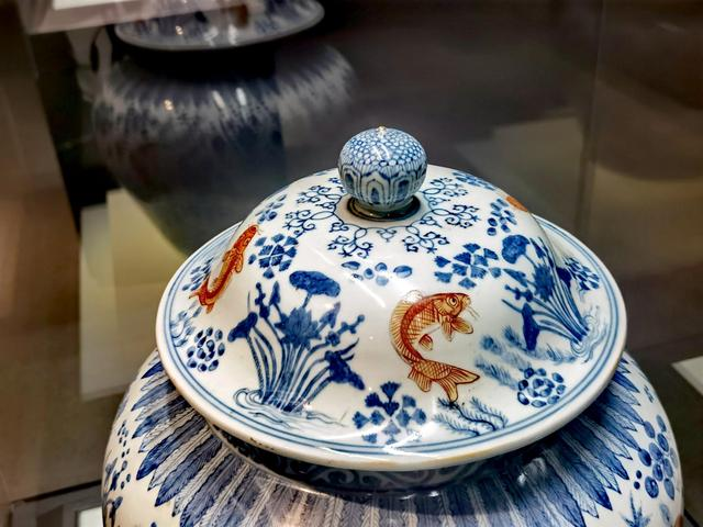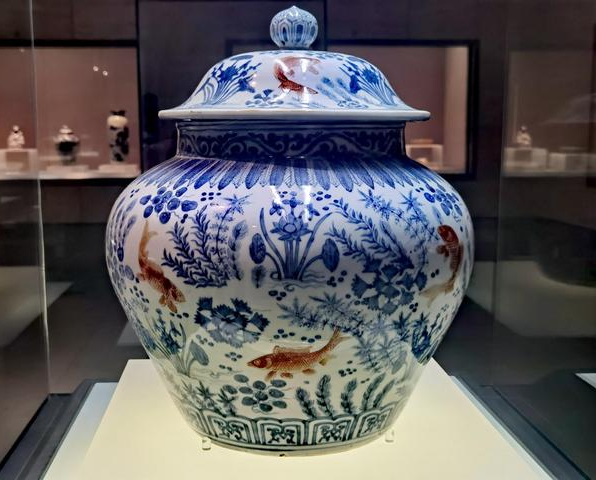 青花紅彩魚藻紋蓋罐,首都博物館。楊曉君拍攝