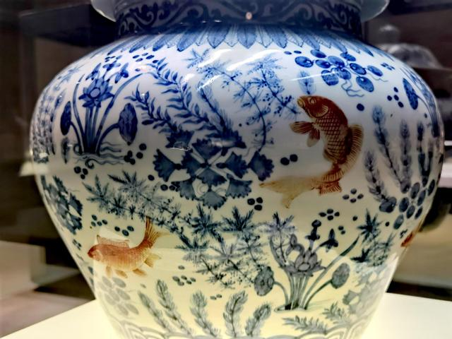 青花紅彩魚藻紋蓋罐,局部,首都博物館。楊曉君拍攝