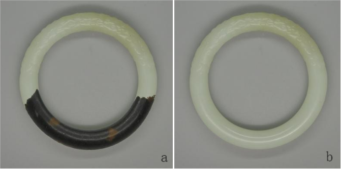 綜合分析可知,該樣品白色部位為和田玉,黑褐色部位為礦物碎屑與人工樹脂的混合物。造假者將礦物碎屑與人工樹脂的混合物充填在和田玉原材料的凹坑等缺陷中,經(jīng)加工打磨,呈現(xiàn)出完整的手鐲外觀。樣品黑褐色部位具有一定的粗糙度,其表面圓形凹坑似和田玉子料的“毛孔”,對于一般和田玉子料消費(fèi)者具有一定的迷惑性。