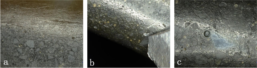 通過光學(xué)顯微鏡觀察發(fā)現(xiàn),樣品白色部位的礦物集合體呈纖維交織結(jié)構(gòu),結(jié)構(gòu)致密。樣品黑褐色部分由若干種混合物質(zhì)組成,不同物質(zhì)之間界限明顯,表面可見圓形凹坑(圖2a);樣品黑褐色部分的表層可被小刀刻劃脫落(圖2b),呈斑塊狀分布的礦物碎塊硬度較高,小刀無法劃動(圖2c)。