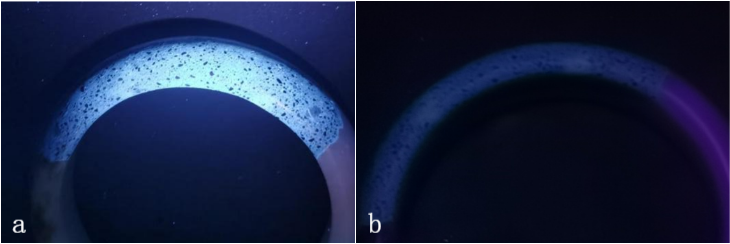 在紫外熒光燈下觀察,發(fā)現(xiàn)該樣品白色部分無熒光,黑褐色部分在長波紫外光照射下呈現(xiàn)強(qiáng)藍(lán)白色熒光(圖3a),在短波紫外光照射下呈現(xiàn)弱藍(lán)白色熒光(圖3b),部分斑塊狀分布的顆粒狀物質(zhì)無熒光。