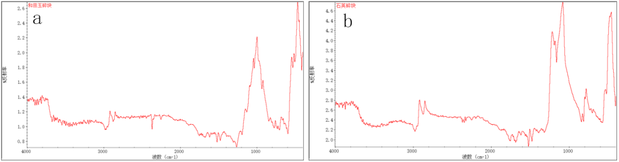 經(jīng)紅外光譜測試發(fā)現(xiàn),該樣品白色部分的主要礦物成分為透閃石(圖4);樣品黑褐色部分可見透閃石與有機(jī)物的混合特征吸收峰(圖5a),局部可見石英與有機(jī)物的混合特征吸收峰(圖5b)。