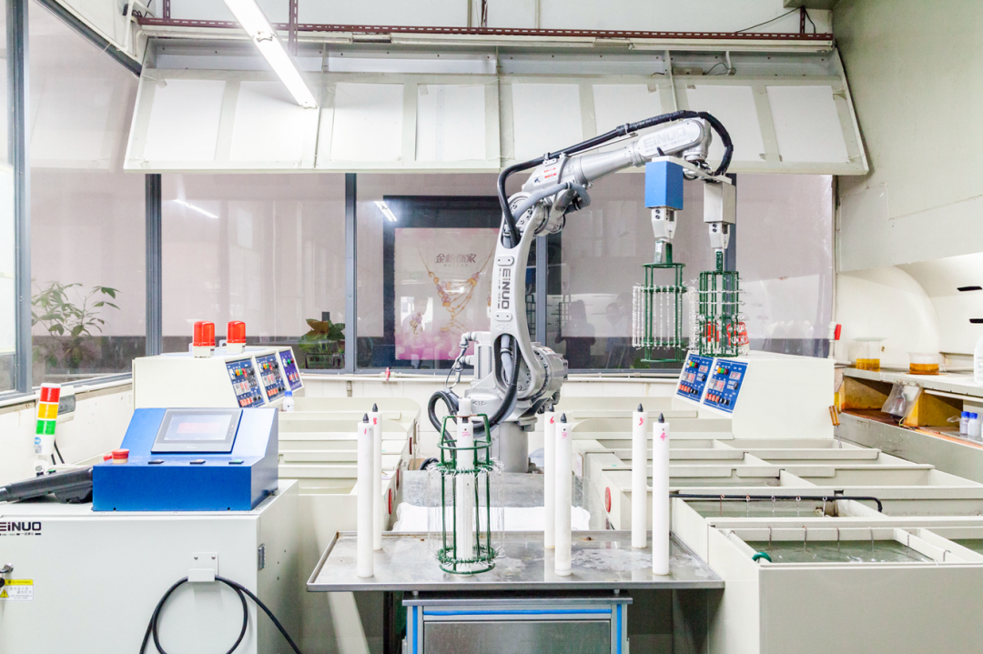 寶福聯(lián)合國際鉑金協(xié)會(huì)(PGI)發(fā)布了“鉑金4.0行業(yè)戰(zhàn)略”,旨在打破珠寶行業(yè)傳統(tǒng)生產(chǎn)模式,引領(lǐng)珠寶產(chǎn)業(yè)鉑金領(lǐng)域的轉(zhuǎn)型升級(jí);從上世紀(jì)90年代的“沖壓機(jī)械”到2000年代“半自動(dòng)機(jī)械”,再到2010年“數(shù)控+3D(三維,下同)建?!?,以及引領(lǐng)未來的“鉑金4.0”,寶福在智能制造領(lǐng)域一直走在業(yè)界前沿,不斷從德國、日本、瑞士、意大利等國家引進(jìn)了CNC計(jì)算機(jī)數(shù)字化控制設(shè)備及數(shù)控系統(tǒng)、織鏈機(jī)、車花機(jī)、3D掃描、3D打印、倒模機(jī)等國際先進(jìn)的生產(chǎn)設(shè)備,將傳統(tǒng)手工和現(xiàn)代機(jī)械制造相結(jié)合,充分發(fā)揮電子機(jī)械、高科技技術(shù)快速精準(zhǔn)的優(yōu)勢(shì),不斷提升產(chǎn)品質(zhì)量,增強(qiáng)加工精細(xì)化程度,豐富珠寶設(shè)計(jì)形式,為新產(chǎn)品的研發(fā)生產(chǎn)夯實(shí)基礎(chǔ),突破傳統(tǒng)首飾制造的“天花板”。同時(shí),寶福引入了自動(dòng)化生產(chǎn)設(shè)備“機(jī)械手”來取代人工工序,大大降低了能耗和生產(chǎn)成本,不僅使產(chǎn)品的標(biāo)準(zhǔn)化程度更高,也讓產(chǎn)品的品質(zhì)更穩(wěn)定。