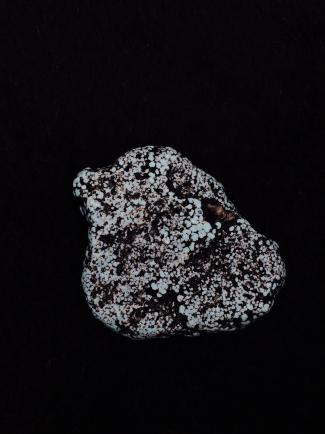 美國(guó)金曼綠松石--黑網(wǎng),密集的鐵線網(wǎng)格是其特點(diǎn)(樣品由北京靚工坊提供)