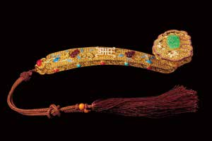 花絲鑲嵌玉石首飾著重表現(xiàn)中國(guó)式題材,以花絲為主,鑲嵌為輔。將細(xì)金工藝與螭虎、蟢子、蝙蝠等玉石或?qū)毷馁|(zhì)的吉祥形象結(jié)合,突出金鑲玉的含義,制造出金玉同輝的藝術(shù)效果。用金絲盤繞的雙線圖案、萬(wàn)壽紋樣和蛛網(wǎng)形狀有著“鎮(zhèn)財(cái)”“福壽”“網(wǎng)喜”的寓意,是細(xì)膩金工與精致玉器的完美結(jié)合。