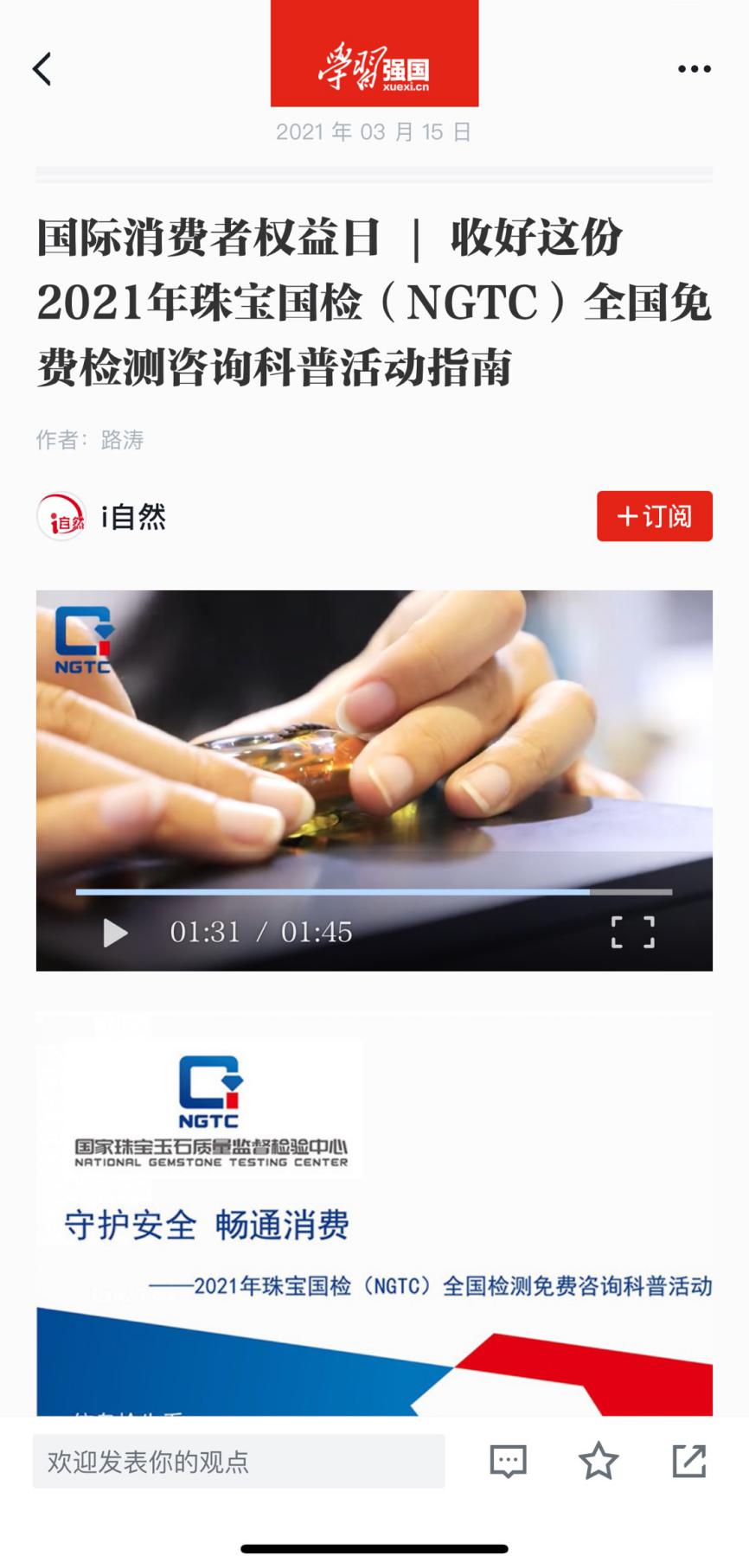 珠寶國(guó)檢(NGTC)助你維權(quán)系列報(bào)道(九)丨“3.15NGTC在行動(dòng)·助你維權(quán)”視頻片和檢測(cè)資訊登陸“學(xué)習(xí)強(qiáng)國(guó)”APP!