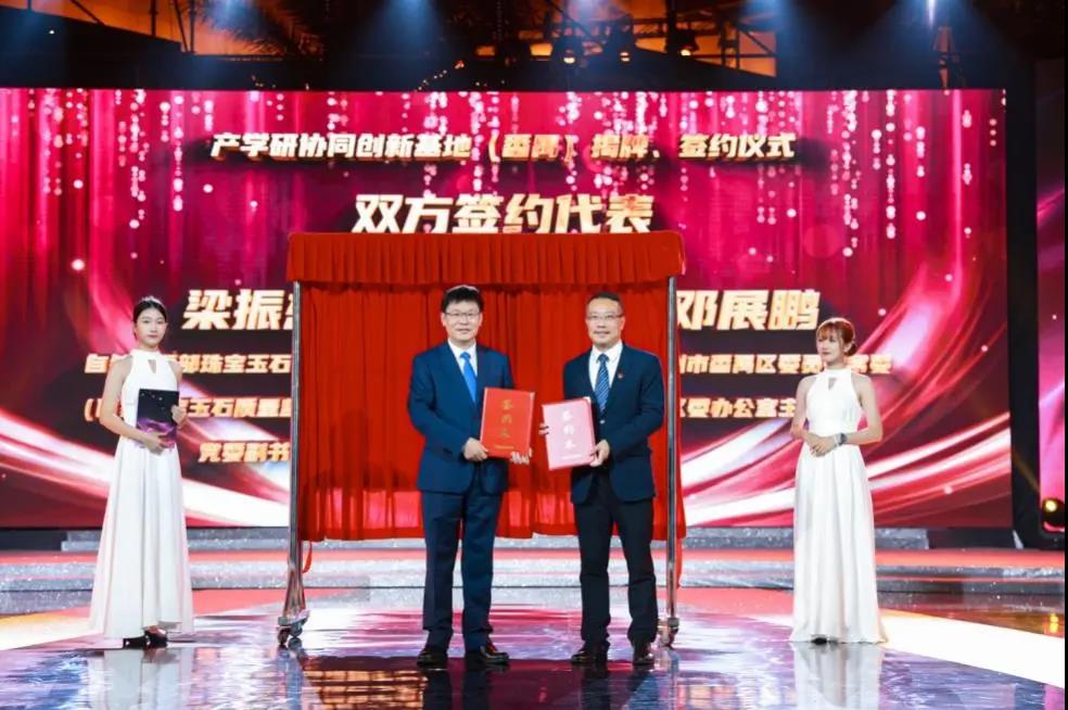 梁振杰與中共廣州市番禺區(qū)委員會常委、區(qū)委辦公室主任鄧展鵬一同為自然資源部珠寶玉石首飾檢驗(yàn)評價(jià)技術(shù)創(chuàng)新中心產(chǎn)學(xué)研協(xié)同創(chuàng)新基地(番禺)揭牌,創(chuàng)新基地正式落戶番禺,預(yù)示基地的各合作方將在 “共商、共建、共贏、共享”共識下,攜手深化合作,共同促進(jìn)番禺珠寶產(chǎn)業(yè)的高質(zhì)量發(fā)展。