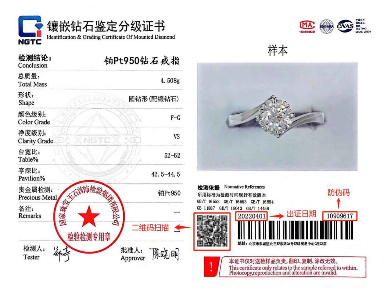 此次更名,珠寶國(guó)檢原有業(yè)務(wù)和經(jīng)營(yíng)范圍不變,證書做了相應(yīng)的調(diào)整。出證機(jī)構(gòu)名稱為“國(guó)家珠寶玉石首飾檢驗(yàn)集團(tuán)有限公司/國(guó)家珠寶玉石質(zhì)量檢驗(yàn)檢測(cè)中心”,檢驗(yàn)檢測(cè)專用章變更為紅章。部分證書樣本及查詢方式示例如下: