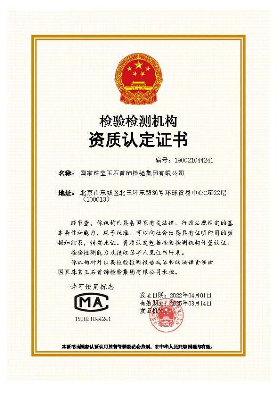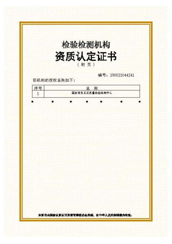 根據(jù)國(guó)家市場(chǎng)監(jiān)督管理總局的相關(guān)工作要求以及珠寶國(guó)檢轉(zhuǎn)企改制的工作安排,2022年4月1日,珠寶國(guó)檢證書正式以“國(guó)家珠寶玉石首飾檢驗(yàn)集團(tuán)有限公司”、授權(quán)名稱“國(guó)家珠寶玉石質(zhì)量檢驗(yàn)檢測(cè)中心”對(duì)外出具證書,資質(zhì)認(rèn)定編號(hào)為:190021044241(見資質(zhì)認(rèn)定證書)。