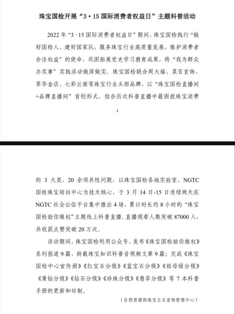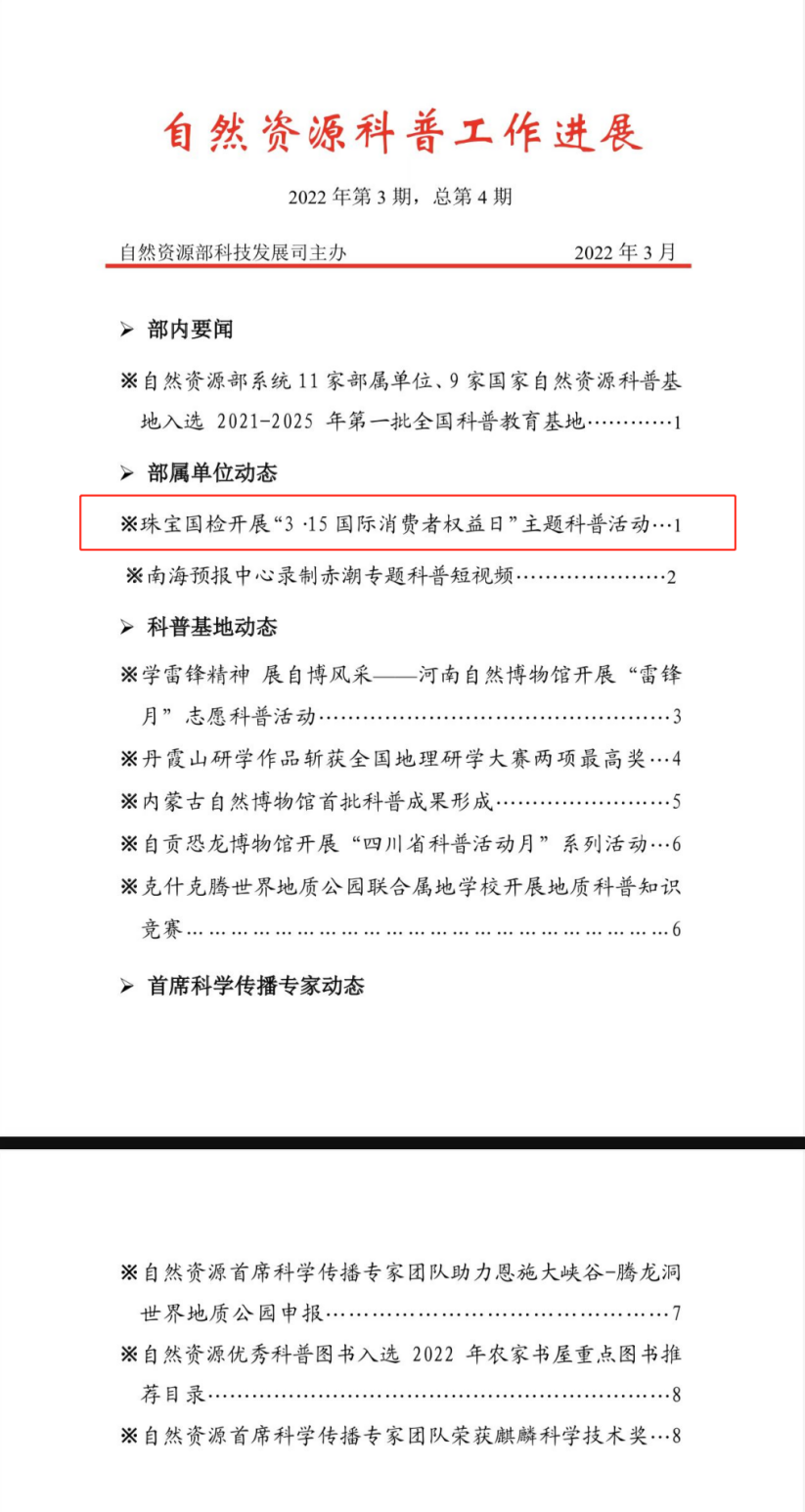 近日,在自然資源部科技發(fā)展司主辦發(fā)布的2022年第三期自然資源科普工作進展中,珠寶國檢今年開展的“3·15國際消費者權(quán)益日”主題科普活動作為部屬單位動態(tài)入選。