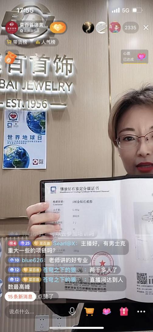 線上觀眾對此次直播報以積極回饋,1個多小時的直播時間,共吸引了超過1.3萬人在線觀看。當珠寶國檢專家介紹實驗室對鉆石的科學檢測方法、解讀鉆石鑒定及分級證書時,兩個直播間同時在線人數(shù)瞬間突破3000人,點贊數(shù)超過6.6萬人次,位列抖音同時段、同類型直播排行榜前列,展現(xiàn)出消費者對寶石礦物科普知識和消費維權方法的極大熱情。