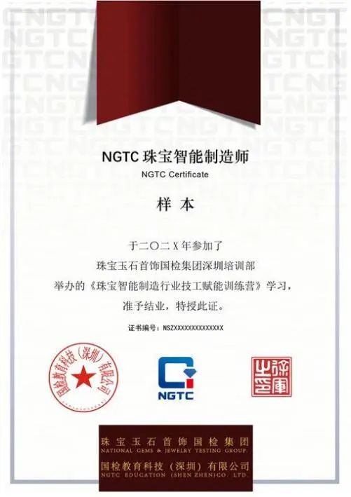 國(guó)檢教育科技(深圳)有限公司為本期培訓(xùn)班學(xué)員提供培訓(xùn)評(píng)價(jià)服務(wù),經(jīng)考核合格的學(xué)員,將獲得“NGTC珠寶智能制作師”認(rèn)證證書。