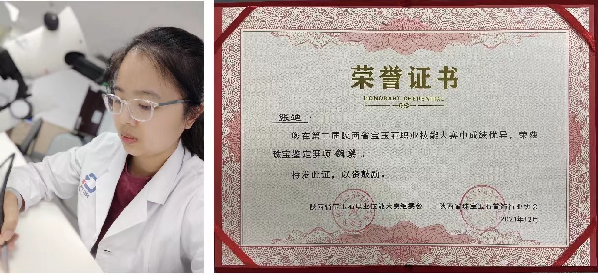 岳盼獲得“陜西省技術(shù)能手”稱號和珠寶鑒定賽事銀獎