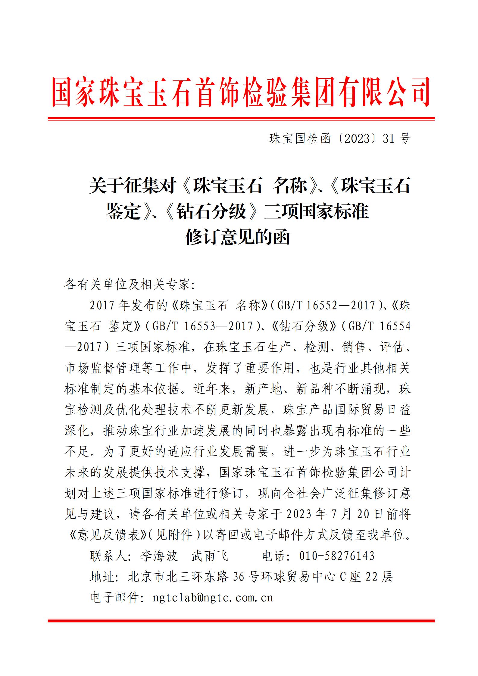 關(guān)于征集對(duì)《珠寶玉石 名稱(chēng)》、《珠寶玉石 鑒定》、《鉆石分級(jí)》三項(xiàng)國(guó)家標(biāo)準(zhǔn)修訂意見(jiàn)的函