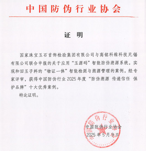 近日,中國(guó)防偽行業(yè)協(xié)會(huì)發(fā)布了2025年度“防偽溯源 傳遞信任 保護(hù)品牌 十大優(yōu)秀案例”,國(guó)家珠寶玉石首飾檢驗(yàn)集團(tuán)有限公司(國(guó)家珠寶玉石質(zhì)量檢驗(yàn)檢測(cè)中心)聯(lián)合高銘科維科技公司推出的“玉源碼”智能防偽溯源系統(tǒng)成功入選。