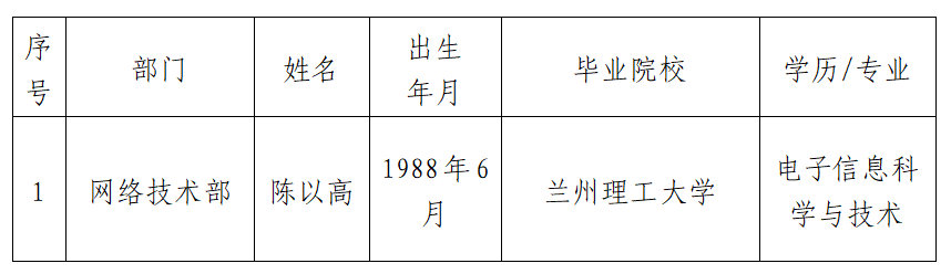 按照自然資源部珠寶玉石首飾管理中心招聘工作方案要求,經(jīng)過(guò)發(fā)布招聘公告、資格審查、面試、體檢等程序,經(jīng)黨委會(huì)議研究,擬聘用陳以高同志為網(wǎng)絡(luò)技術(shù)部工作人員,現(xiàn)予以公示。