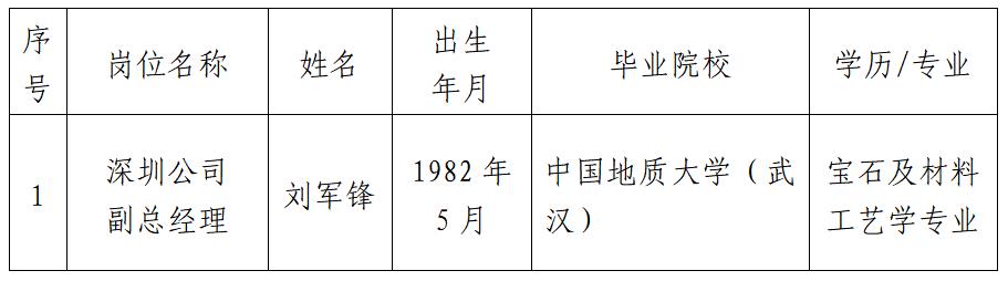 按照國(guó)家珠寶玉石首飾檢驗(yàn)集團(tuán)有限公司招聘工作方案要求,經(jīng)過發(fā)布招聘公告、資格審查、面試、體檢等程序,經(jīng)黨委會(huì)議研究,擬聘用劉軍鋒同志為深圳公司副總經(jīng)理,現(xiàn)予以公示。