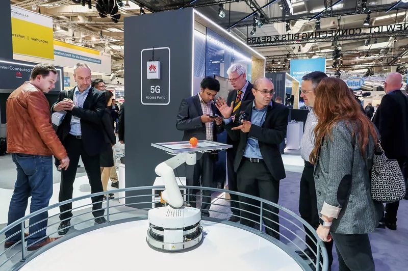 圖為2018年4月24日,在德國漢諾威工業(yè)博覽會上,參觀者在華為公司展區(qū)觀看運(yùn)用第五代移動通信技術(shù)(5G)操控的機(jī)器人。新華社記者 單宇琦/攝