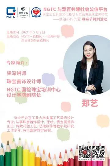 5月的第二個星期日是“母親節(jié)”,珠寶國檢(NGTC)與菜百首飾聯(lián)合策劃了一場有趣的珠寶科普手繪課——《繪“生”? 繪“色”》,為媽媽們獻(xiàn)上不一樣的節(jié)日禮物,屆時,NGTC國檢珠寶培訓(xùn)中心首飾設(shè)計專家——鄭藝?yán)蠋煂ьI(lǐng)小朋友進(jìn)行愛的涂鴉,用畫筆為媽媽設(shè)計、描繪母親節(jié)禮物!