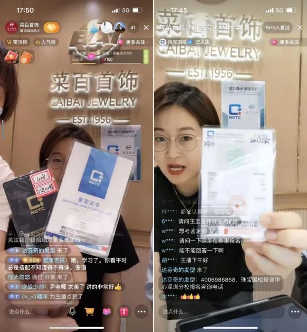 廣大網(wǎng)友對此次珠寶國檢抖音直播間、菜百首飾抖音直播間從文化、設(shè)計(jì)、選購入手,進(jìn)行翡翠消費(fèi)知識科普的方式感到耳目一新,對設(shè)計(jì)有興趣的網(wǎng)友在線咨詢了珠寶國檢培訓(xùn)中心設(shè)計(jì)、手繪課程的報(bào)名、培訓(xùn)地點(diǎn)等情況。本次直播,珠寶國檢抖音直播間與菜百抖音直播間共收獲網(wǎng)友點(diǎn)贊1.4萬余次,吸引觀眾人數(shù)1.1萬人次,平均在線觀看人數(shù)超過110人/秒,位列該時段科普類直播前列。