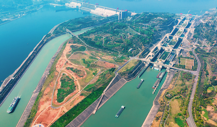 2023年一季度,三峽樞紐航運(yùn)通過(guò)量3989.36萬(wàn)噸,同比增長(zhǎng)22.08%,創(chuàng)投運(yùn)以來(lái)一季度航運(yùn)通過(guò)量最高紀(jì)錄。圖為船舶有序通過(guò)三峽雙線五級(jí)船閘和升船機(jī)(2023年4月1日攝) 鄭家裕攝 / 本刊