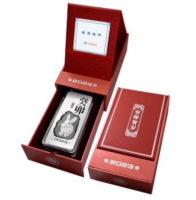 癸卯(兔)年發(fā)行的賀歲銀條規(guī)格共計六種:1,000克、500克、200克、100克、50克和15克,最大發(fā)行量分別為600條、1,500條、3,000條、21,000條、36,000條和10,000條,成色均為99.9%。本套銀條在延續(xù)經(jīng)久不衰的生肖主題的同時,秉承一貫的設(shè)計和工藝風格,采用鏡面、浮雕、噴砂等先進工藝,線條細膩、層次分明,既具有收藏投資價值,又具有藝術(shù)觀賞價值,是一款值得入手的藝術(shù)藏品。