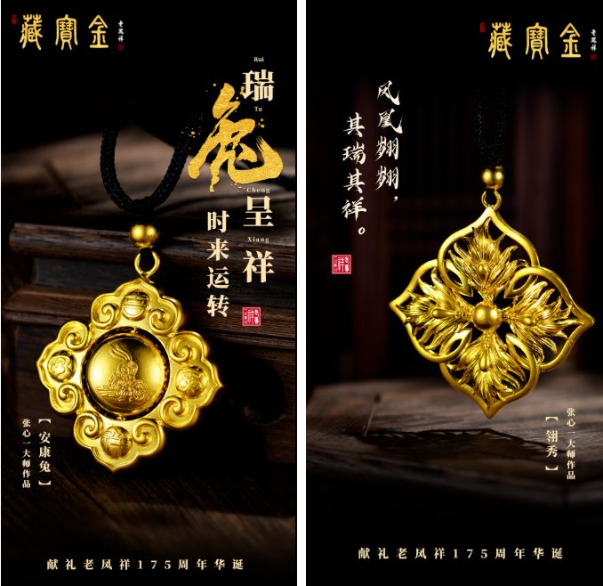 “藏寶金”是老鳳祥貴金屬制品中典藏級高端精品的總稱。老鳳祥“藏寶金”源于古代皇室宮廷文化,經(jīng)過不斷傳承創(chuàng)新,發(fā)展至今。該系列產(chǎn)品是以老鳳祥所獲得的國家級非物質文化遺產(chǎn)代表性項目名錄“金銀細工制作技藝”為基礎,并結合現(xiàn)代新工藝所精心制作的首飾、器皿、掐絲琺瑯制品、手編花絲等系列產(chǎn)品,具有高度的美學藝術鑒賞價值和傳承價值。中國工藝美術大師張心一獻禮老鳳祥175周年華誕的新力作——《安康兔》與《翎秀》,用獨特的首飾語言展現(xiàn)了中國傳統(tǒng)文化精髓,傳遞美好祝福。
