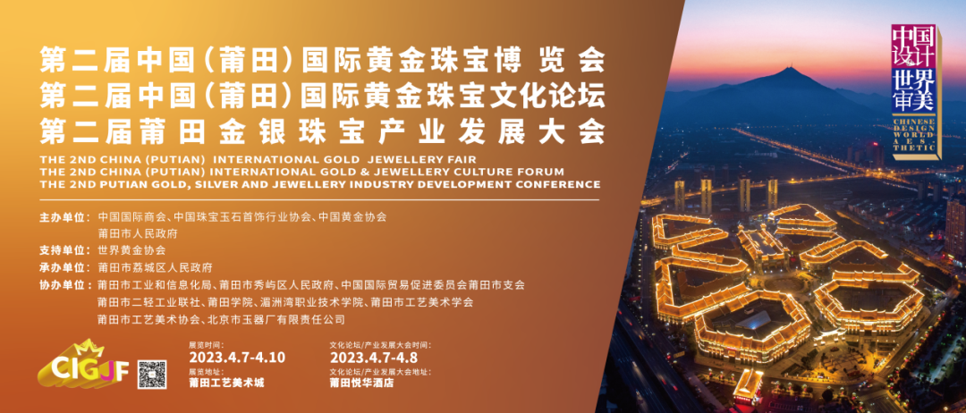 3. 創(chuàng)新品牌力量、助力產(chǎn)業(yè)升級 本屆博覽會著眼于促進中國黃金珠寶首飾行業(yè)新時代下的國際化進程,致力于將首屆博覽會孵化的鄉(xiāng)村振興項目“莆城故事·工美小鎮(zhèn)”的轉(zhuǎn)型蝶變再次展現(xiàn)給世界人民。鄉(xiāng)村振興與博覽會發(fā)揮各自優(yōu)勢、互相賦能,以全方位、多角度的合作姿態(tài),共同將鄉(xiāng)村振興推上文化特色發(fā)展道路。 “中國設(shè)計·世界審美” 第二屆中國(莆田)國際黃金珠寶博覽會 讓我們共話中華優(yōu)秀傳統(tǒng)文化交流盛事, 共享世界黃金珠寶視覺盛宴, 共筑跨界融合產(chǎn)業(yè)發(fā)展新高地, 共譜傳承創(chuàng)新發(fā)展新篇章。 第二屆中國(莆田)國際黃金珠寶博覽會 時間:【2023年4月7—10日】 地點:【莆田工藝美術(shù)城】